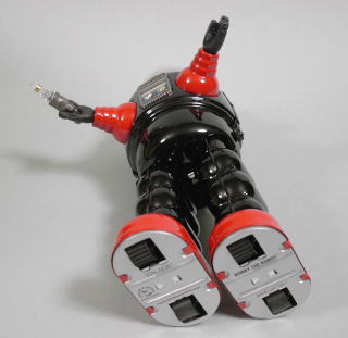ゼンマイ歩行ロビー、ブリキ製 お手ごろサイズの約24センチ 大阪ブリキの復刻版 個人的にはブリキだったらこれ位のサイズがいいと思います 部屋に飾っておくのにもちょうどいい位の大きさ レトロなデザインは手にしても愛着が湧きます 胴体左部分にゼンマイを入れて巻くと 口部分を発光させながら歩き出します ゴム製の手には光線銃 最後に足の裏側