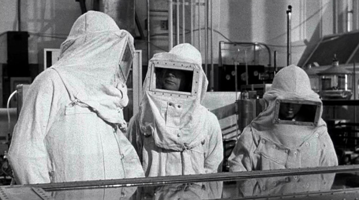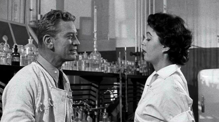 艦長マシューズを演じているのはケネス・トビーという役者さんなのですが、この人は『遊星よりの物体X』(1951)で主人公の軍人、ヘンドリー大尉を演じていました。物体Xを生かしておこうと主張する科学者と対立し、基地内にある粗末な武器を駆使して物体Xに立ち向かう勇敢な男でした。ハリーハウゼンの『原子怪獣現る』(1953)でも軍人役で出演。そして、『水爆と深海の怪物』では潜水艦の艦長マシューズ役で主役として登場。つまり、1950年代の怪物退治の専門家というわけです。ニヒルで、どの映画でも必ずタバコを口にくわえているのが特徴。