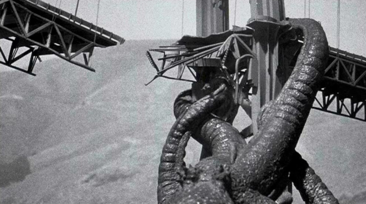 ハリーハウゼンの仕事はかなり丁寧で、形状は単なる巨大なタコなのですが、破壊シーンなどはいかにもモンスターらしく仕上がってしいます。ブリッジのシーンでの重量感もなかなかのもので、触手の丸まり方などの生々しい動きは必見。橋が軋む効果音も恐怖感を煽る。タコが去った後の内側に曲がったブリッジが怪物の破壊力を物語っていました。