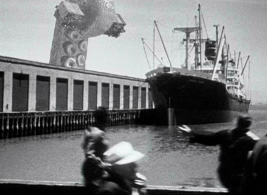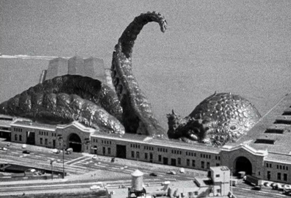次は停泊している船舶の向こう側に1本の足だけが海面から上がってくるシーン。個人的には一番好きな場面で、実写の船との合成で怪物の大きさが際立って見える。