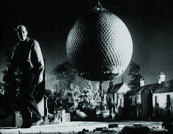 この場面は昔見た時には全て実写だと思っていたのですが、実際は気球は人の背丈くらいの大きさで作られており、収容所なども精密なセットを作り移動マットで実写と合成している。