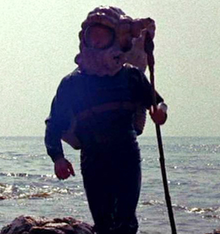 巨大な貝で作られた酸素ボンベを背中にしょっている姿はなんともユニーク(間抜け)で、この場面を見た時に、「あっ、昔この映画、見たことある!」と確信したシーンでもあります。