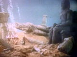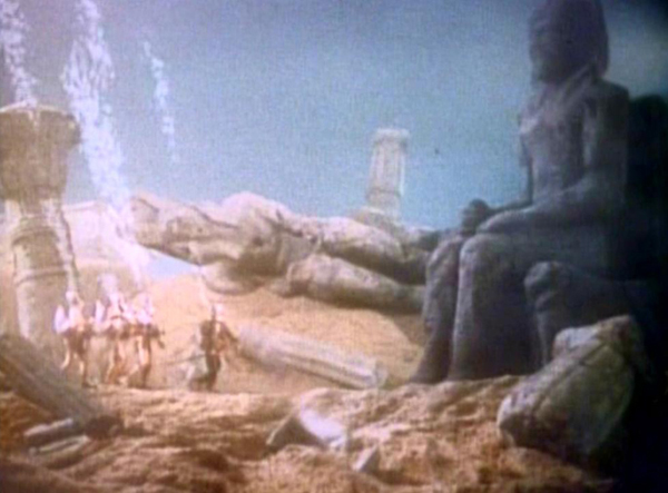 ネモ船長を含めた八人は沈没した海賊船を修理して島を脱出する計画を立てる。間抜けな潜水服を着て海底で作業を行うための訓練をする場面があるのですが、このシーンでは本当に貝を背負った状態で実際に水中で撮影しているそうです。背景に見える海底の神殿やその他の建造物は特撮ファンへのサービスカットか、素晴らしい。