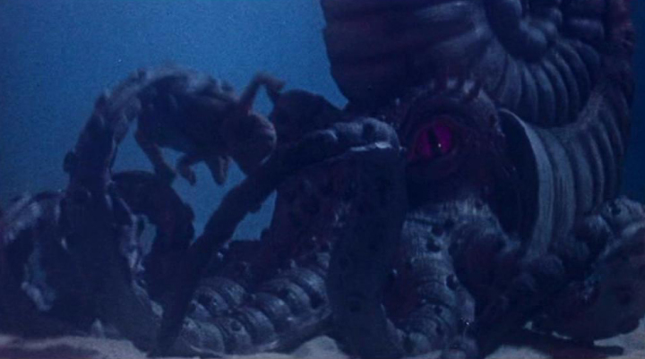 作業に取りかかり、潜水服で気球を海賊船に運ぶ途中に、この映画最後の巨大生物であるオウムガイに遭遇。これ、アンモナイトだ。でも顔の部分はタコのような造形。この巨大オウムガイはネモ船長の電気銃であえなく死亡。