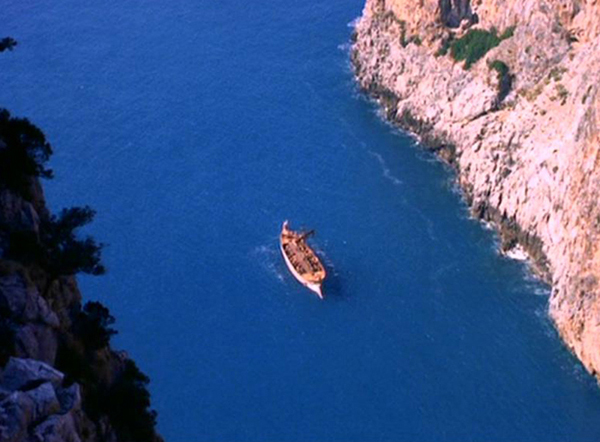 ジェイソンたちがどうやって通り抜けようかとためらっていると向かいから別の船がやってくるが、やはりというべきか両側から大量の岩が崩れ落ち、船は海に沈んでしまう。