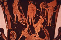 「よかろう。それでは本当にあなたがたに神の加護があるのか見せてくれ。この地に軍神アレスの雄牛がいる。脚は青銅、口から火を吹く暴れ牛だ。この牛にくびきをつけて畑を耕してくれ。その畑に私が竜の歯を撒くと、大勢の兵士がそこから湧いてくる。その兵士たちを一人残らず打ち倒してみせてくれたら金の羊毛皮をお返ししよう。」