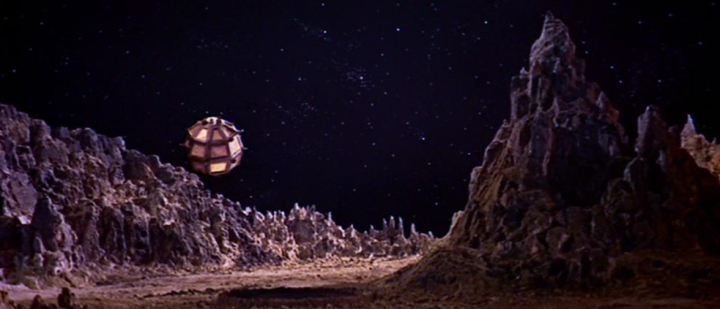この宇宙船、名前をスペース・スフィアという。重力を遮るための可動性のブラインドが付いた窓と、着陸時の衝撃吸収用の脚が四方八方についたその形状は、科学的考証などそっちのけだが、とにかくそのデザインは秀逸の一言。あっという間に月に到着した宇宙船は、月面に突っ込んでゴロンゴロンと転がり、月面の突起物にぶつかって止まる。絶対に中の人間は即死だろうというものすごい着陸の仕方だが、何故かこれが素敵だ。しかし、この映画はあまりにも突っ込みどころが多すぎて、あまりそればかり言ってると悪口に聞こえそうだからこれ以降は自粛することに決めました。