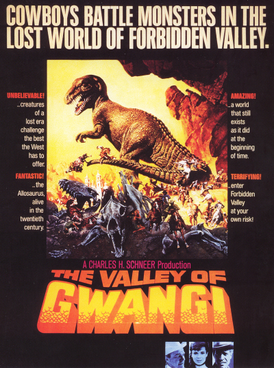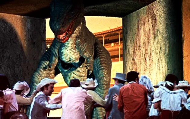 秘境で太古の生物を発見し、都会に連れ帰って見世物にしようとしたが檻から逃げ出してしまい、街は大パニック!というストーリーはモンスター映画の定番で何の新鮮味も無いものですが、西部劇と合体させた事により、言葉では言い表せない独特な雰囲気を持つ映画に仕上がった。こんな身近に恐竜が生き残っている秘境があったとは、新鮮というか、無理があるというかは微妙なところですが・・・