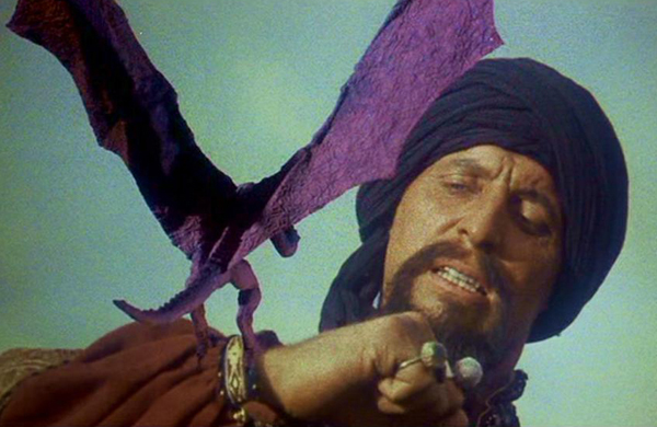 一度は断ったシンドバッドであったが、店の使用人が彼が夢で見た「掌に目が描かれた女性」である事が解ると、彼女も連れて行くという条件で、息子を引き受ける事を承諾。そしてこのぐうたら息子が、この映画でのお調子者の役柄を演じることになる。