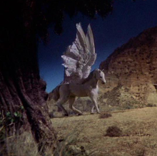 この場面以外でもたびたび登場することになるペガサスのアニメーションはジム・ダンフォースが担当しています。体力の衰えを感じたハリーハウゼンが、一番信頼しているジム・ダンフォースに協力を依頼したとの事。空中で足を動かしながら大きな翼を羽ばたかせ、文字どおり天を駆け抜けるペガサスの動きは美しく、ハリーハウゼンに代わってアニメートしたダンフォースの素晴らしい仕事に思わず拍手。
