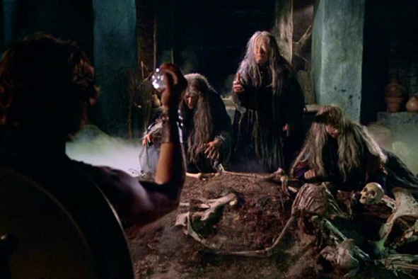 ペルセウス一行が、まず最初に訪れたのが、クラーケンを倒す方法を知っているといわれる三人の老婆の住処。ギリシャ神話でもおなじみの、三人で一つの目を共有しているというあの老婆たちだ。ブーボを利用して老婆たちから目を奪い、脅してクラーケンを倒す方法を聞き出した後は、その目を放り投げて返すという英雄にあるまじき行為をするペルセウス。どっちが悪党だかわからん・・・