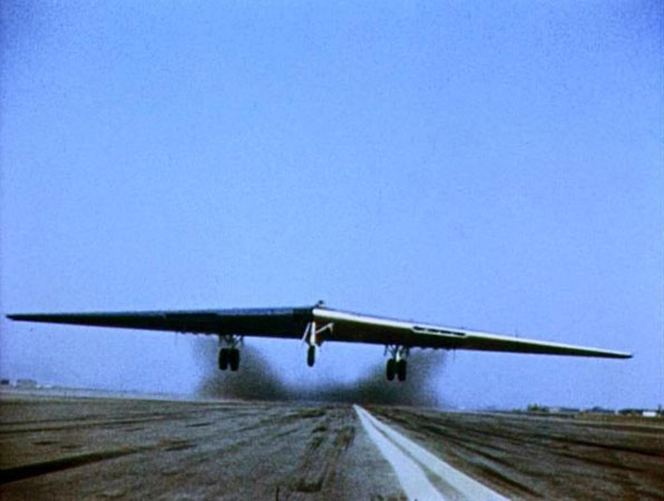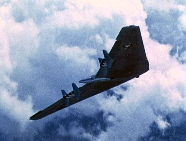 ここで人類側の核爆撃機として登場するのが「フライング・ウイング」という兵器。ステルスを連想させる翼のみの戦闘機で「全翼機」と呼ばれています。現実にこんな飛行機が存在するという事をこの映画で初めて知った時にはかなり驚きました。映画で使用されているのは、全翼機の資料映像であり、本来は映画とは無関係のものですが、違和感なく本編の映像に挿入されています。