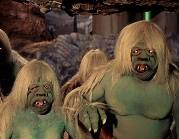 イーロイが金髪で白人(なんと全員)であるのに対し、モーロックは緑色。美男美女(とも言い切れないが)に対し、醜悪な顔とは、まだ根強かった人種差別の現れでしょうか?悪役が全身緑色というのは特撮映画の定番で、時代を感じさせます。昔の映画にはこういうのが多いですね。
